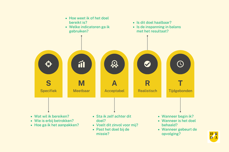 We nemen de vijf onderdelen hieronder stap voor stap onder de loep, met een beetje uitleg en reflectievragen. De 5 criteria van SMART doelen worden uitgelegd aan de hand van het voorbeeld: "Ik wil beter leren omgaan met moeilijke gesprekken op het werk". Van dit vage voornemen maken we een SMART doelstelling.