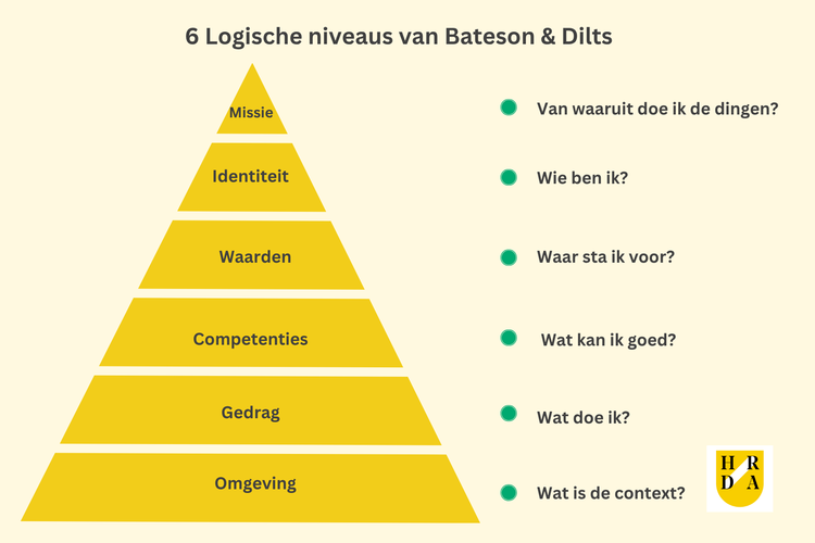 Hieronder nemen we je mee door elk niveau van de piramide van Bateson en Dilts en geven we concrete handvatten, enkele mogelijke reflectievragen en een uitgewerkt voorbeeld uit de coachingpraktijk.